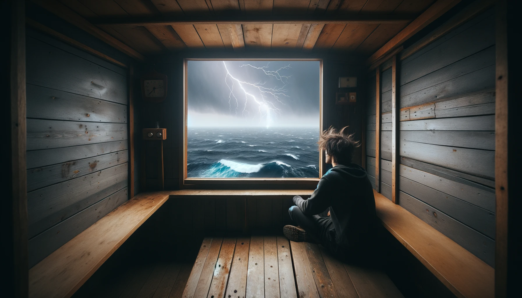 Alors, un ouragan se lève. La panique m’assaille et je décide de fuir la cabane. Mais juste avant de partir, j’aperçois entre les vagues, gigantesques et terrifiantes, un petit voilier. Sa lutte contre les éléments semble vaine. Hypnotisé par son destin, à chaque assaut des vagues, je crains sa disparition.