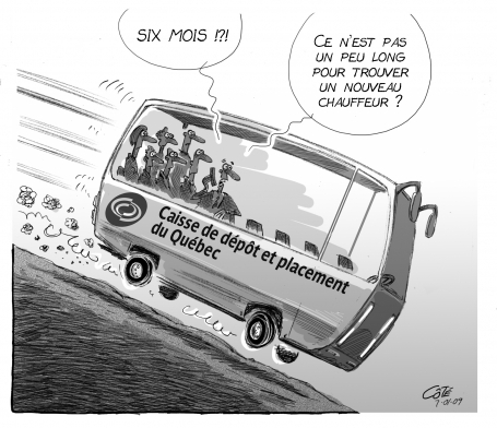 D’ailleurs, on parle beaucoup ces temps-ci de la Caisse de dépôt et placement; ce magnifique héritage de la Révolution tranquille mis au monde par Jacques Parizeau. Dans un premier temps, nous avons appris que son ancien président, Henri-Paul Rousseau, a volontairement quitté son poste pour en accepter un autre encore plus lucratif chez Power Corporation (!!!)… non sans prendre au passage une «indemnité» de 378 000 $. En considérant que le bas de laine des Québécois a fondu du quart en un an (la Caisse avait amorcé l’année 2008 avec 155,4 milliards dans les coffres pour terminer avec 120 milliards en décembre), c’est donc dire ici que « nous » récompensons Henri-Paul Rousseau pour la perte astronomique de 38 milliards de fonds publics sous sa direction. Wow! Et comble de l’irresponsabilité, huit mois après le départ de Rousseau, la Caisse demeure toujours sans direction effective ?!? ![]()