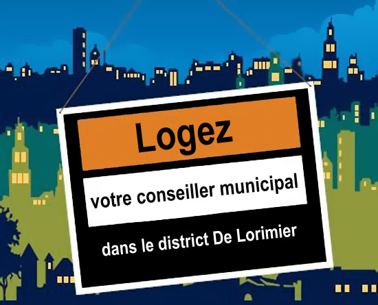 Afin de m’immerger davantage dans ma nouvelle vie de conseiller municipal, je cherche à me loger dans le district De Lorimer (Est du Plateau). Nonobstant la localisation géographique, mes critères se résument à un 4 ½ (une chambre fermée + un bureau) en dessous de 1000$ (ce qui est déjà pas mal trop cher). De la sorte, si vous croyez connaitre un logement qui pourrait satisfaire à mes attentes, n’hésitez pas à me contacter.