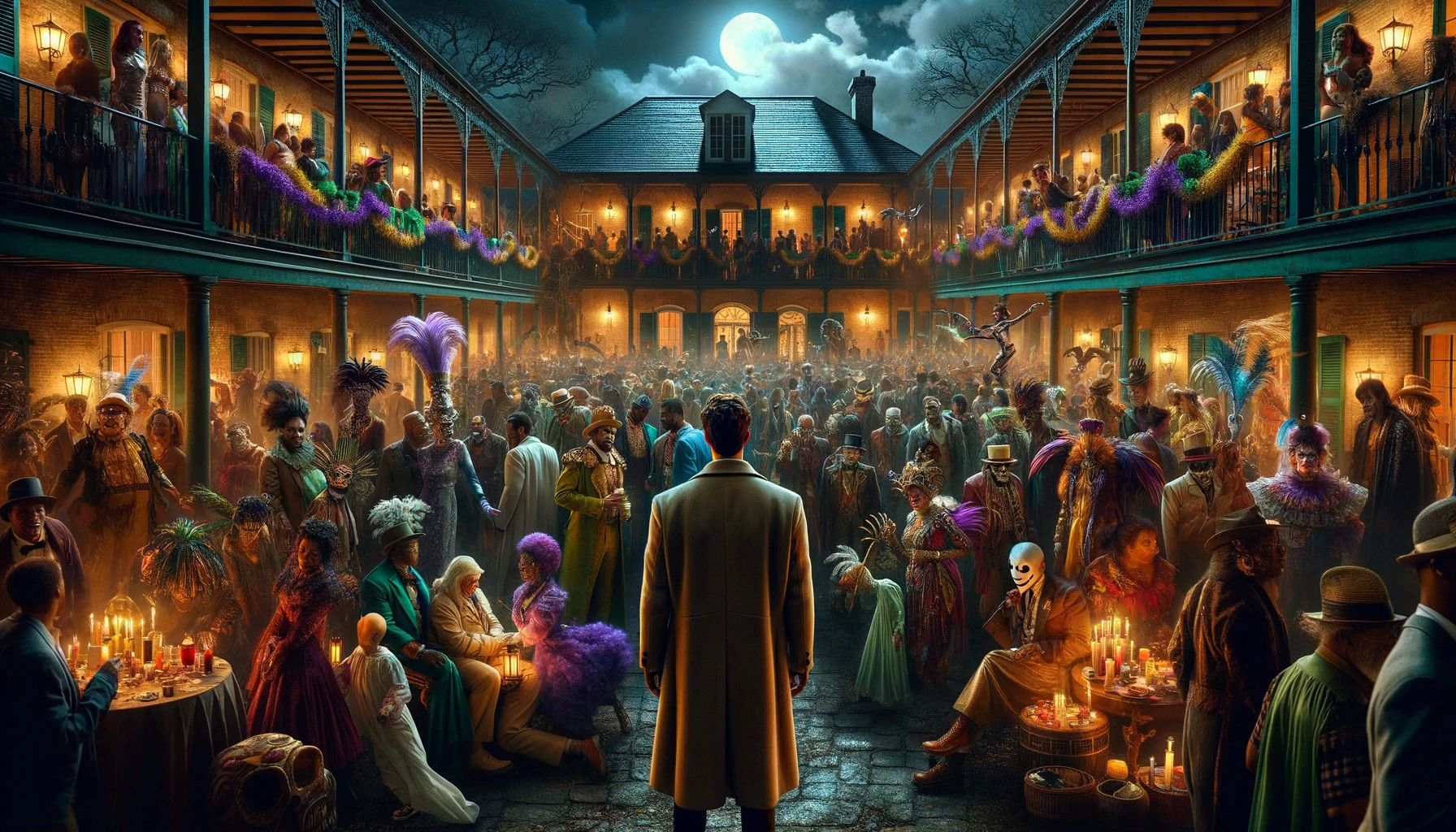 Dans la chaleur enveloppante d’une nuit de la Nouvelle-Orléans, je me retrouve subitement au cœur d’une fête exubérante, rappelant les festivités du Mardi Gras. Cette célébration se déploie dans une villa majestueuse, où, au milieu de la cour, je me tiens seul, absorbé par l’ampleur de l’événement.